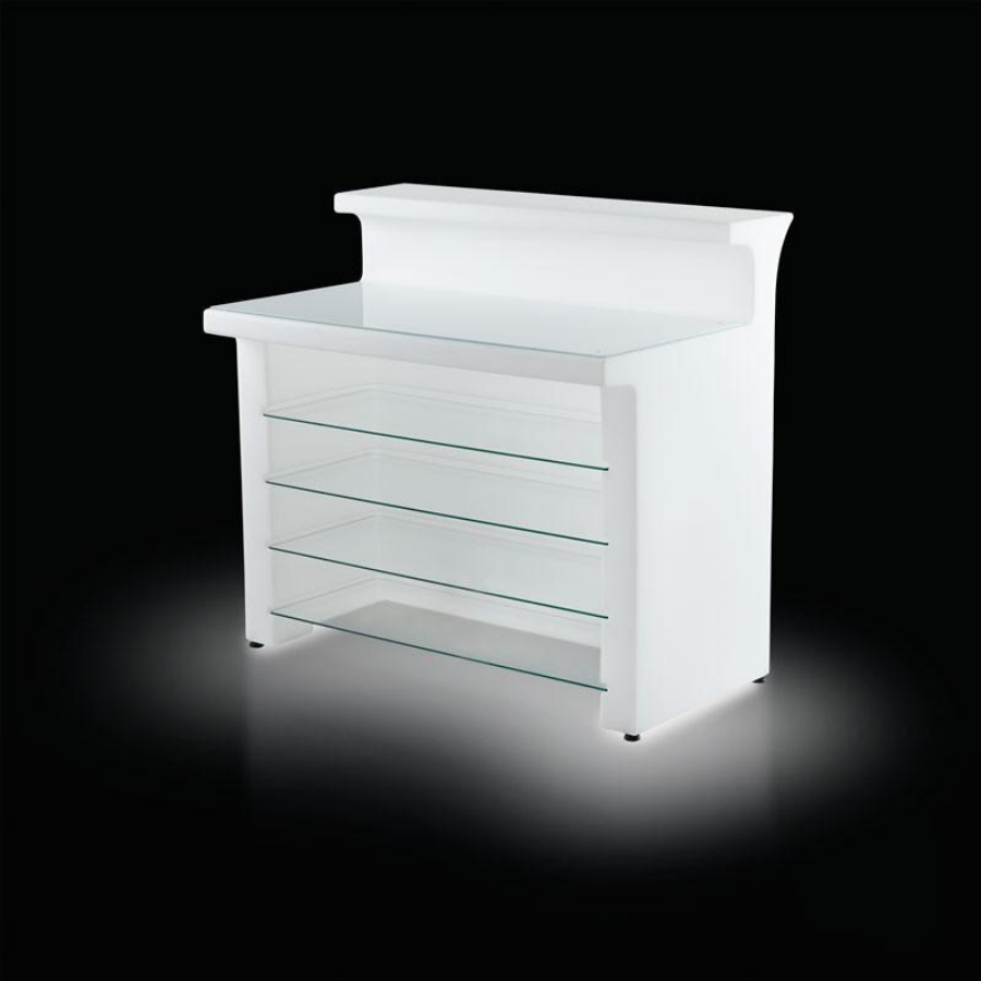Ce bar peut devenir plus fonctionnel et élégant, grâce au plateau en verre qui peut recouvrir une partie du comptoir, version blanche avec lumière.