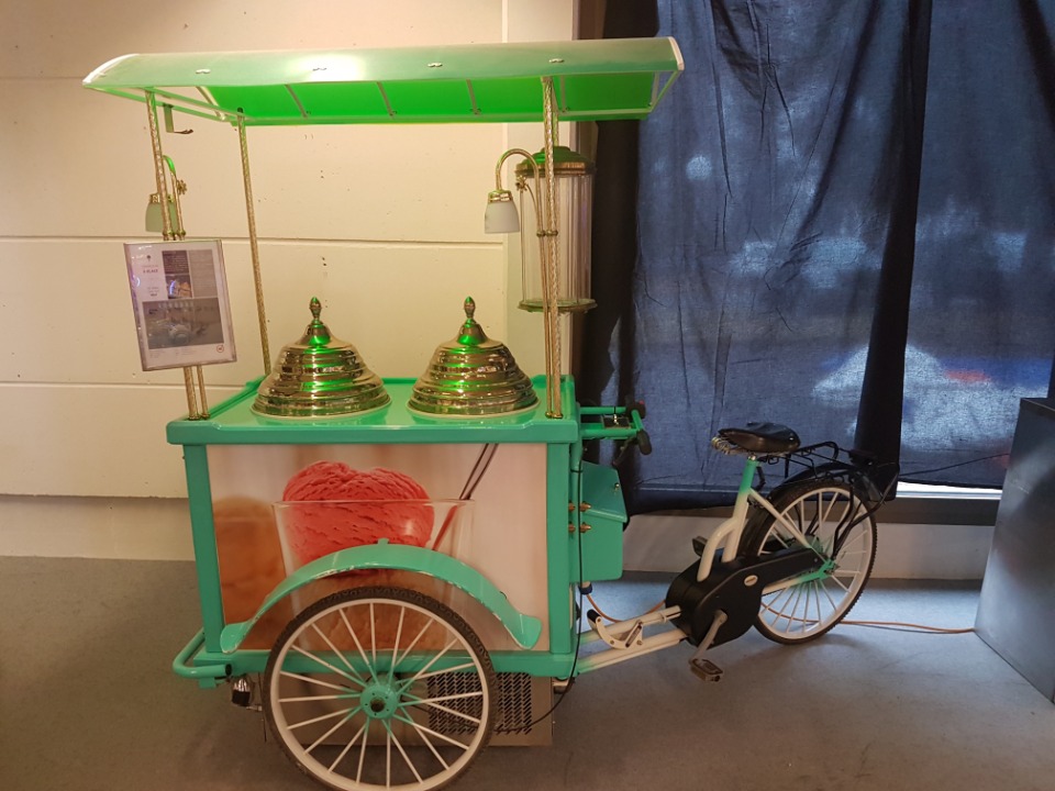 - Le triporteur dispose d'un petit coffre pour stocker du matériel, contenance possible de glaces, 5 bacs de 4,5 l